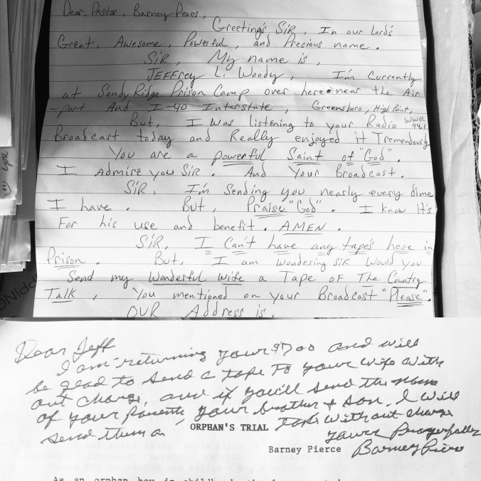 Fourth letter into the hundreds I’ll be going through over the next few days and I find this one, from “Jeffrey L. Woody…at Sandy a Ridge Prison Camp.” This is from the stack that came addressed to my grandfather’s radio broadcast requesting a tape of his “Country Talk” (who knows exactly, other than it’s something about Jesus and something about hope–even for the prisoner). He originally had sent with it “nearly every dime [he had].”